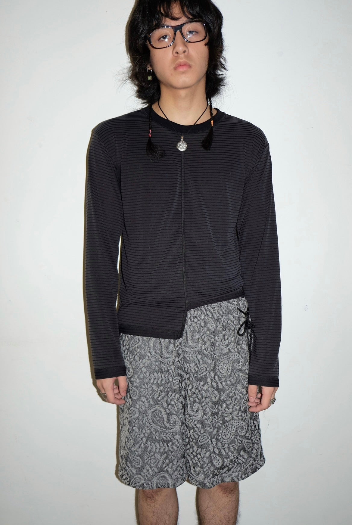 Made in dead stock gray paisley terrycloth fabric. Featuring adjustable string design on each side.
