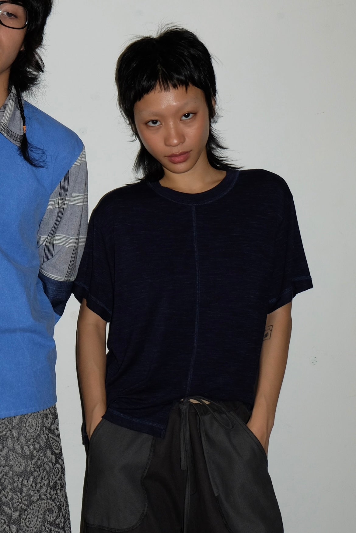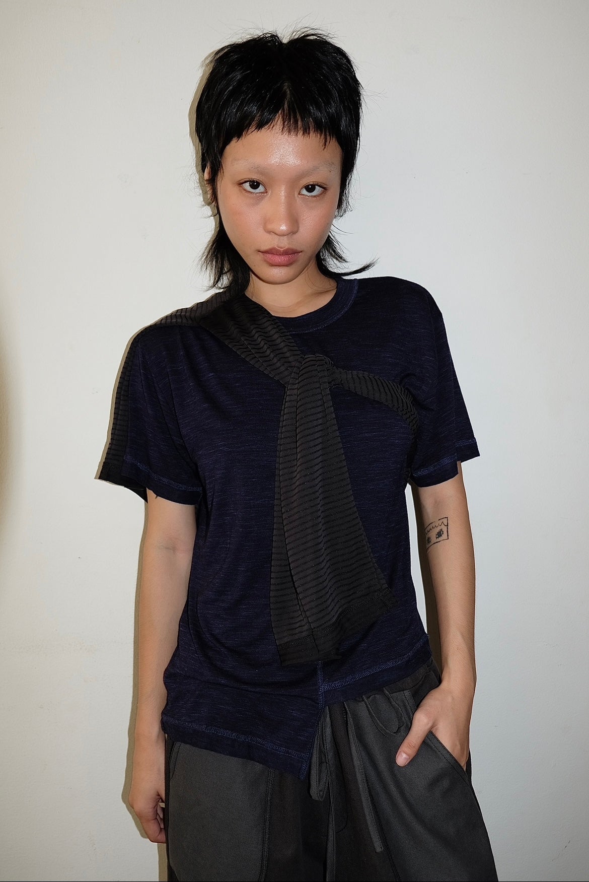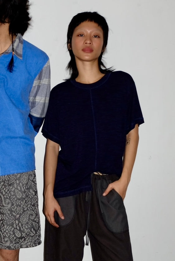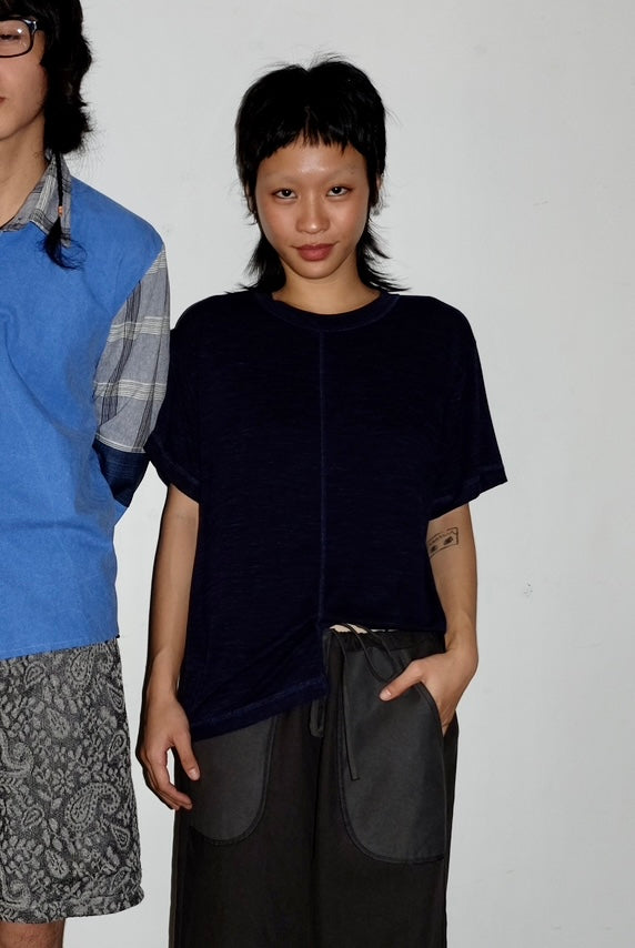 Made in dead stock navy blue cotton jersey fabric. Featuring uneven hemline design.