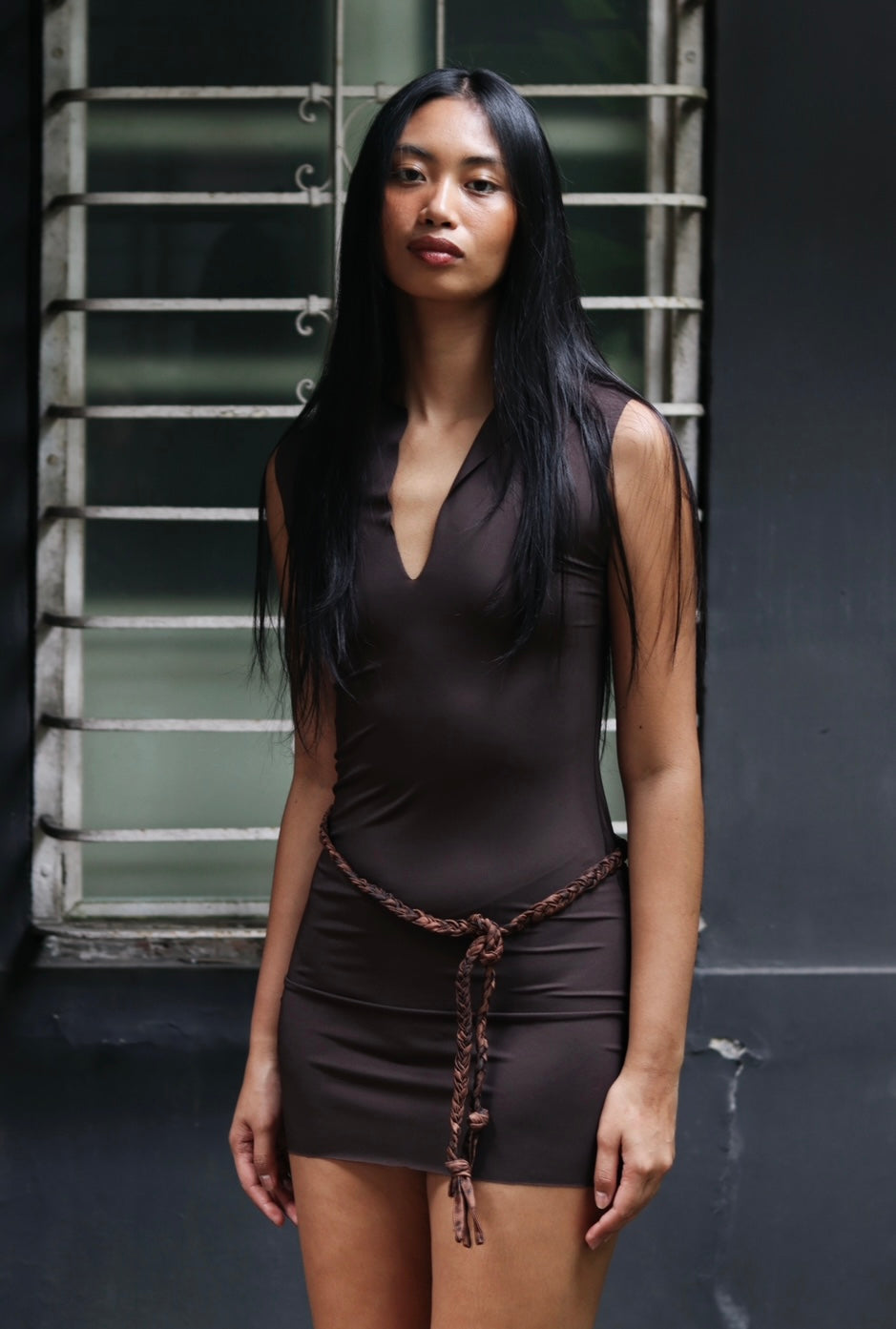 Deep brown mini dress with retaso twisted belt.
