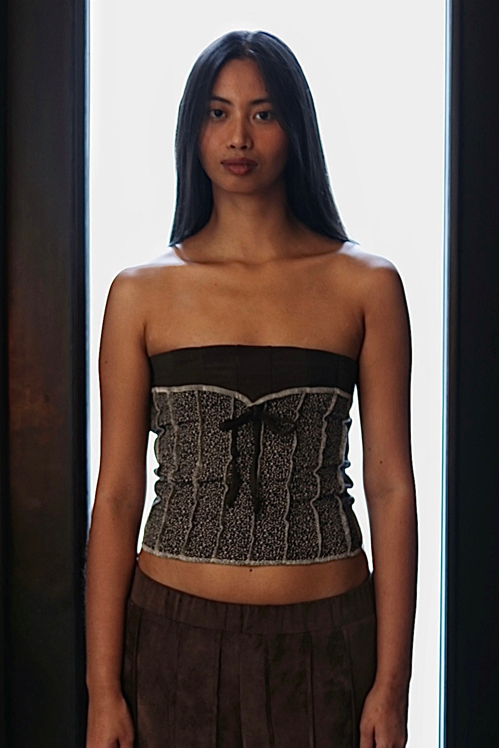 Laure tube top in chicory brown in pebble print fabric. Featuring panelled strips sewn together to create a corset design aspect.