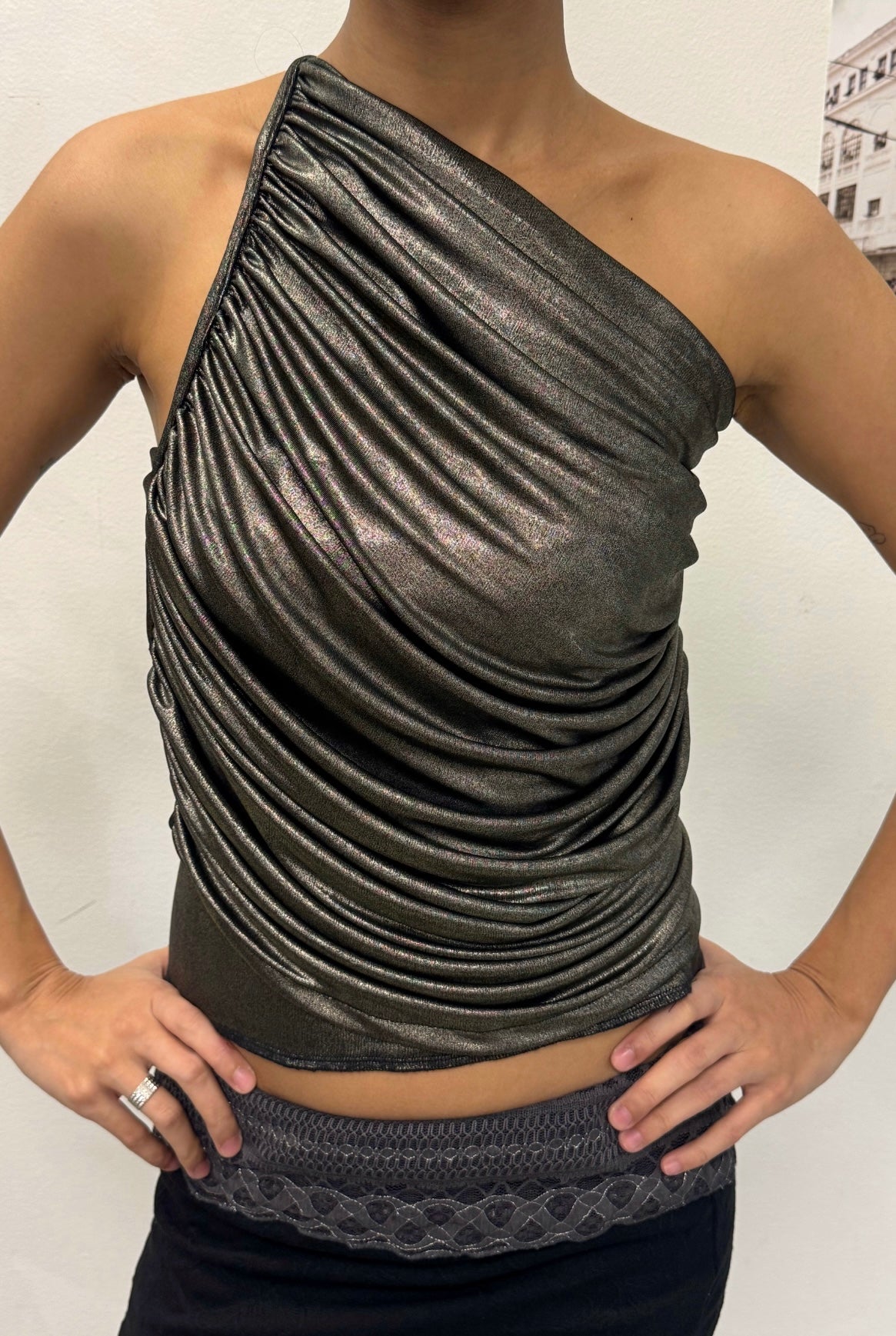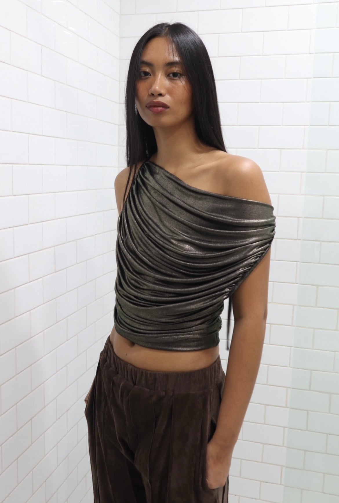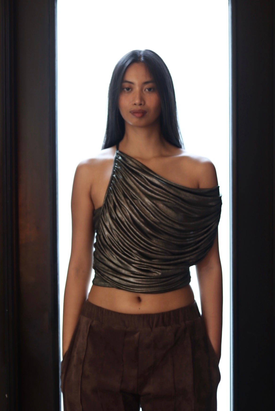 Cowl draped bodice, backless top in gold coast that ties over the neck.
