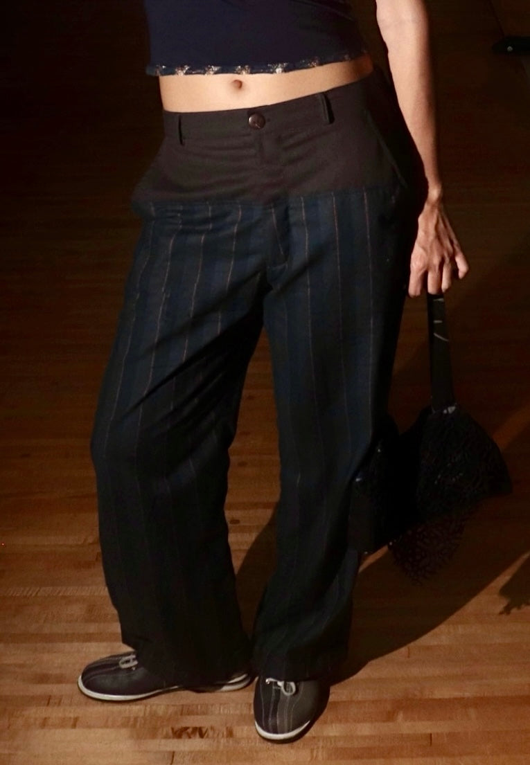 Charcoal grey and stripe blue trousers with elasticated back waistband.